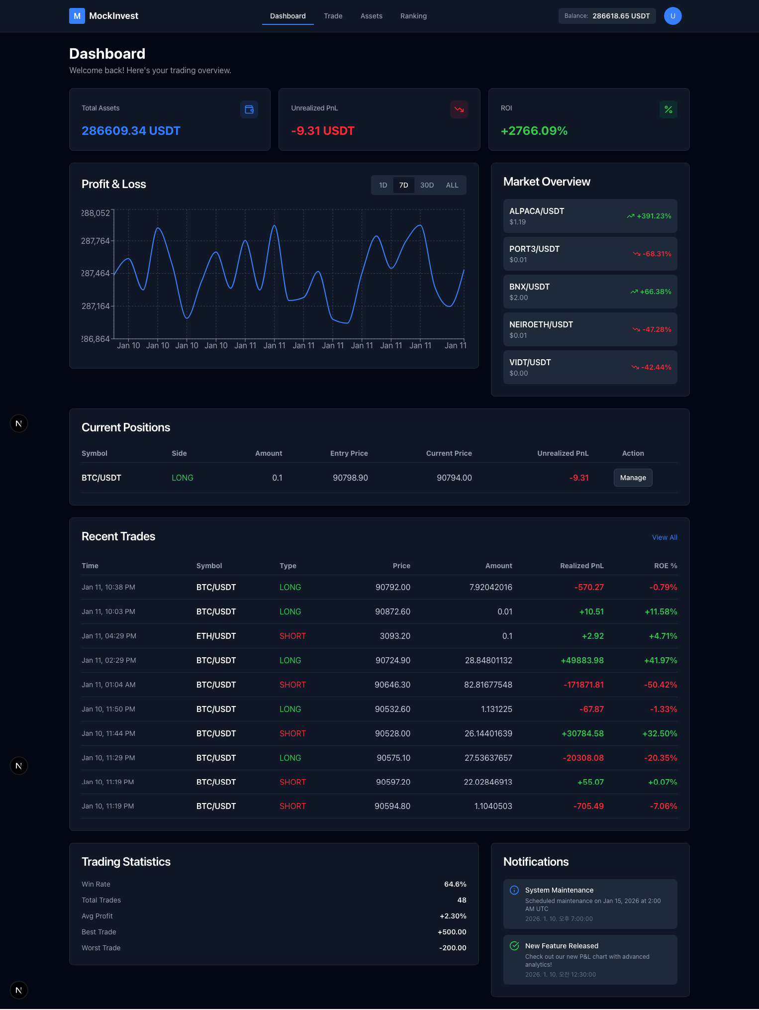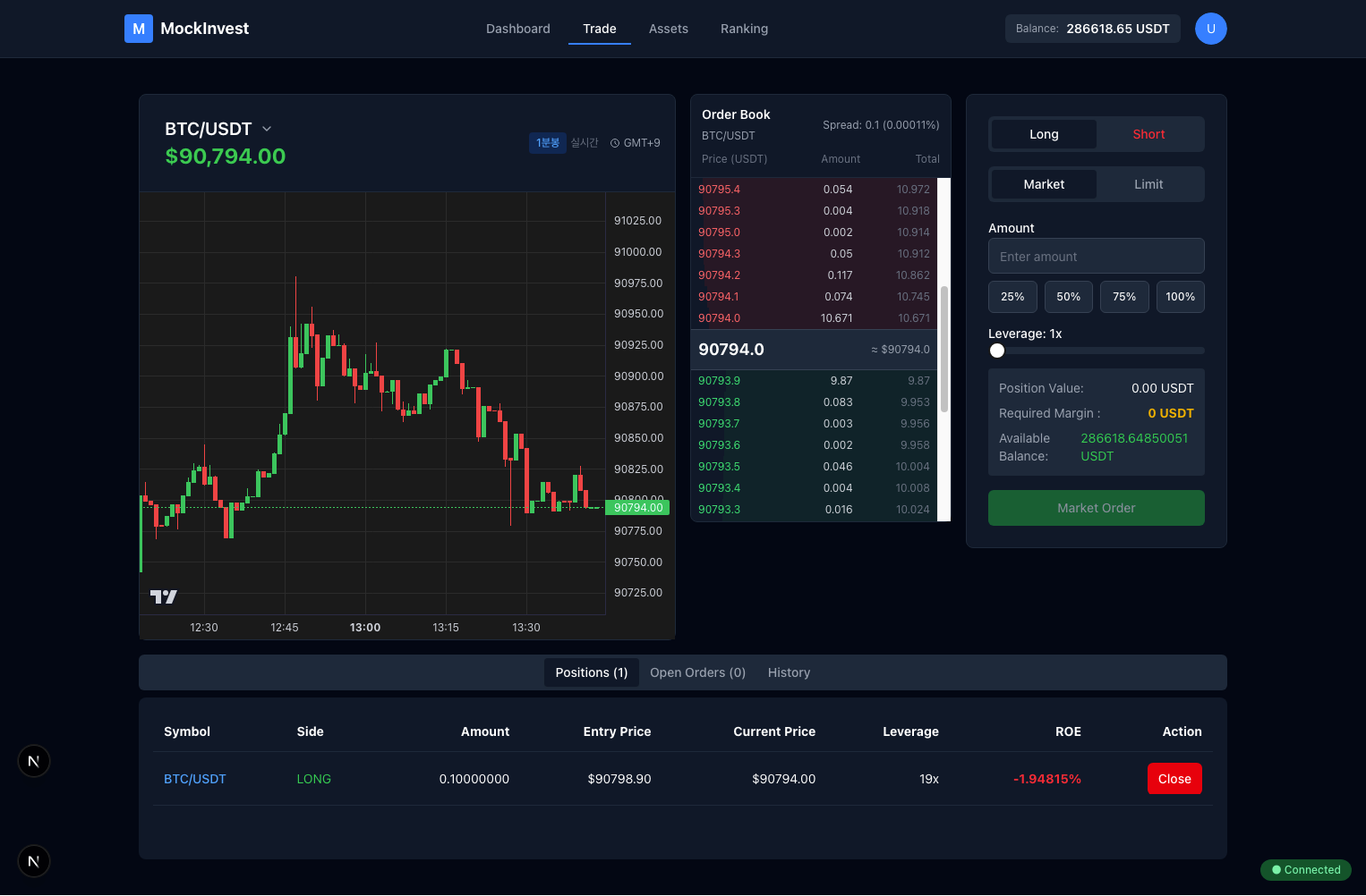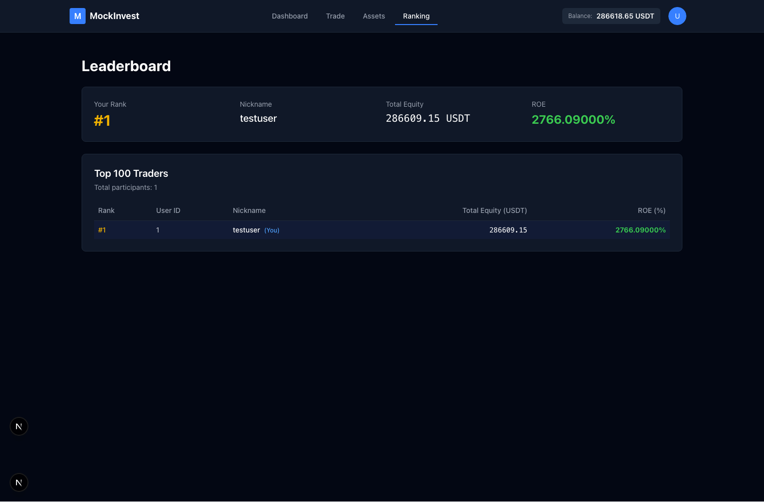 YouTube로 보기Landing 서비스 소개 및 핵심 지표 요약Dashboard 실시간 포지션, 레버리지, 손익 현황Trade 주문 패널과 차트 기반 모의거래Assets 자산 현황과 포지션 상세 분석Ranking 수익률 기반 리더보드포트폴리오로 돌아가기